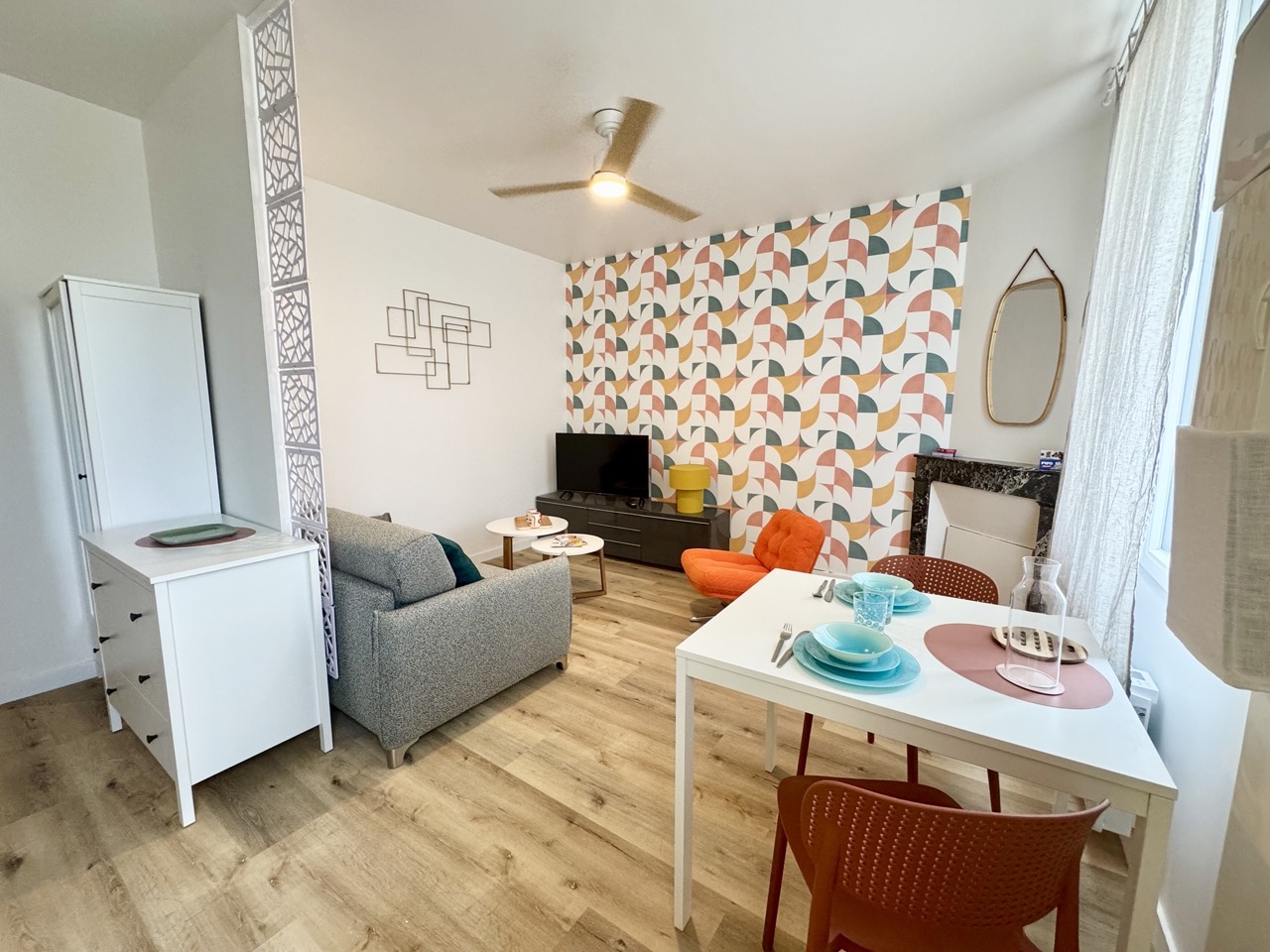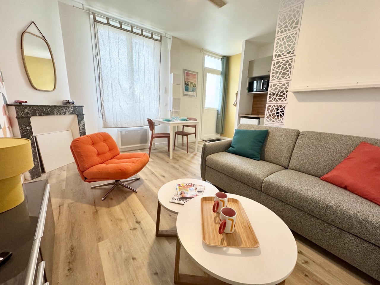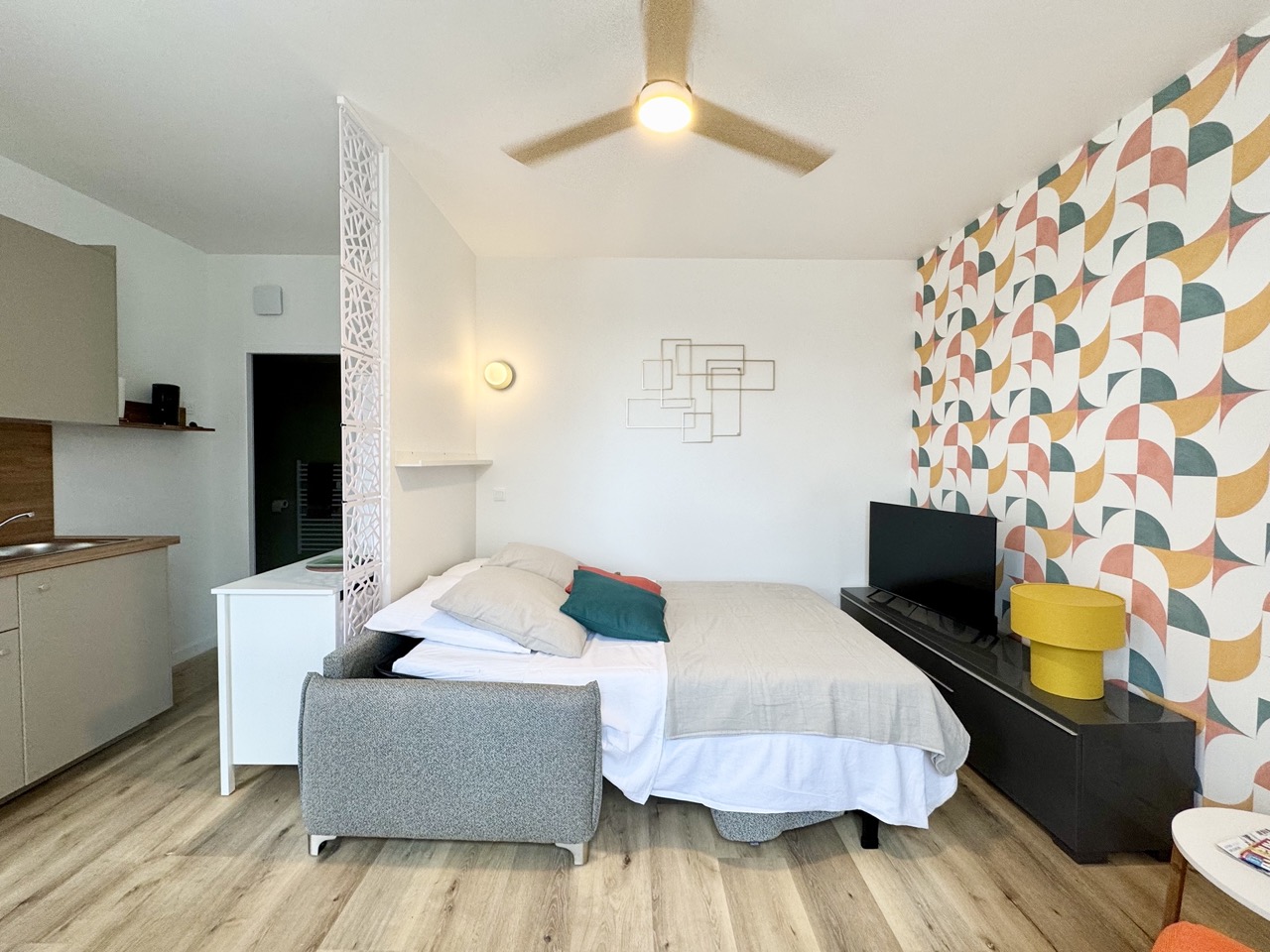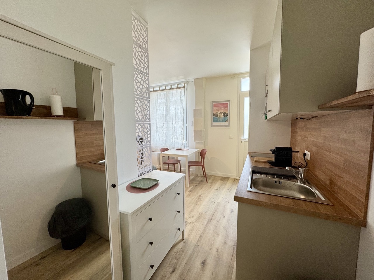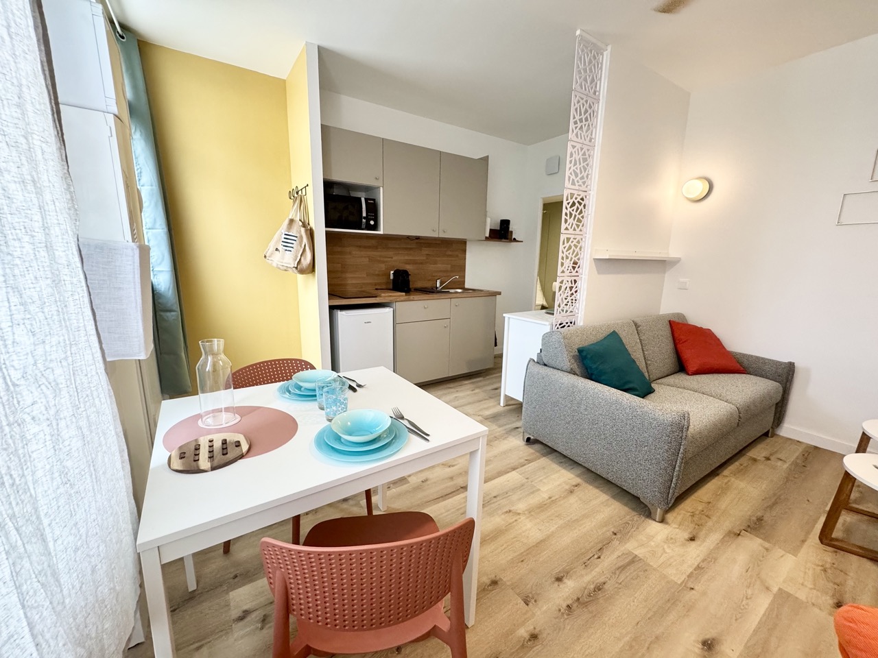 Malgré sa surface compacte, le studio a été entièrement optimisé pour offrir un maximum de fonctionnalités. Il intègre une cuisine aménagée et équipée, des rangements dédiés aux vêtements, ainsi qu’un espace repas / travail installé face à la fenêtre pour profiter pleinement de la lumière naturelle.