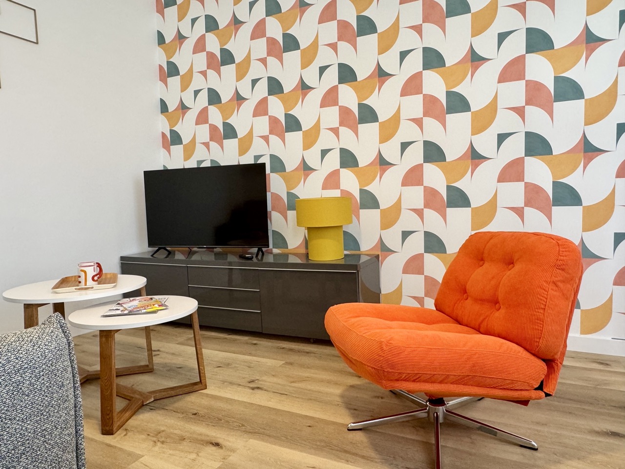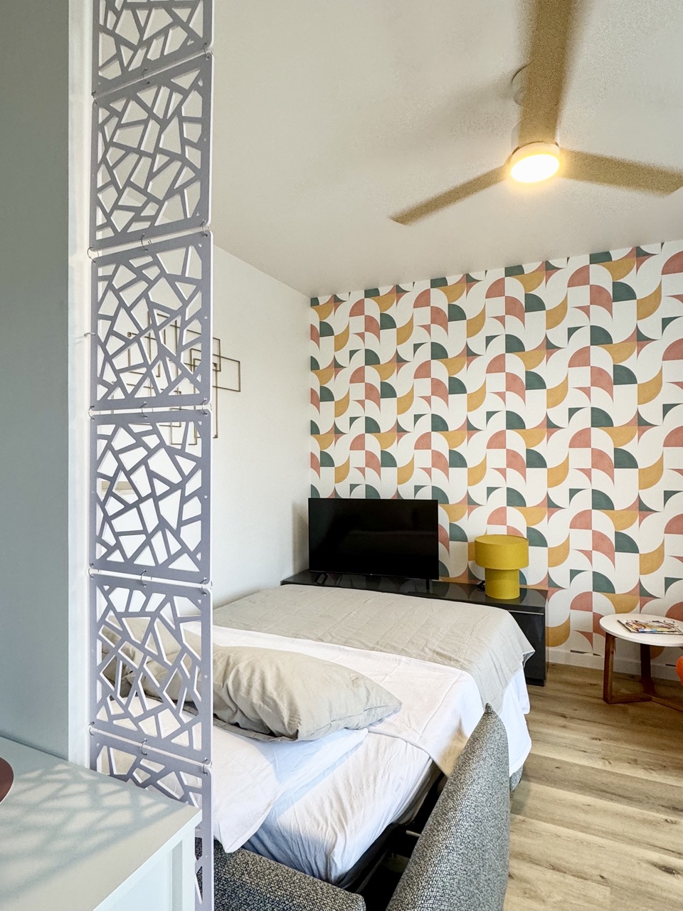 Le troisième logement du projet est un studio de 25 m², imaginé spécifiquement pour la location courte durée. L’approche de conception diffère volontairement des autres appartements : l’objectif était de créer un lieu marquant, attractif et immédiatement séduisant pour les voyageurs.