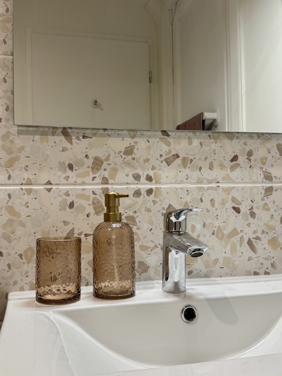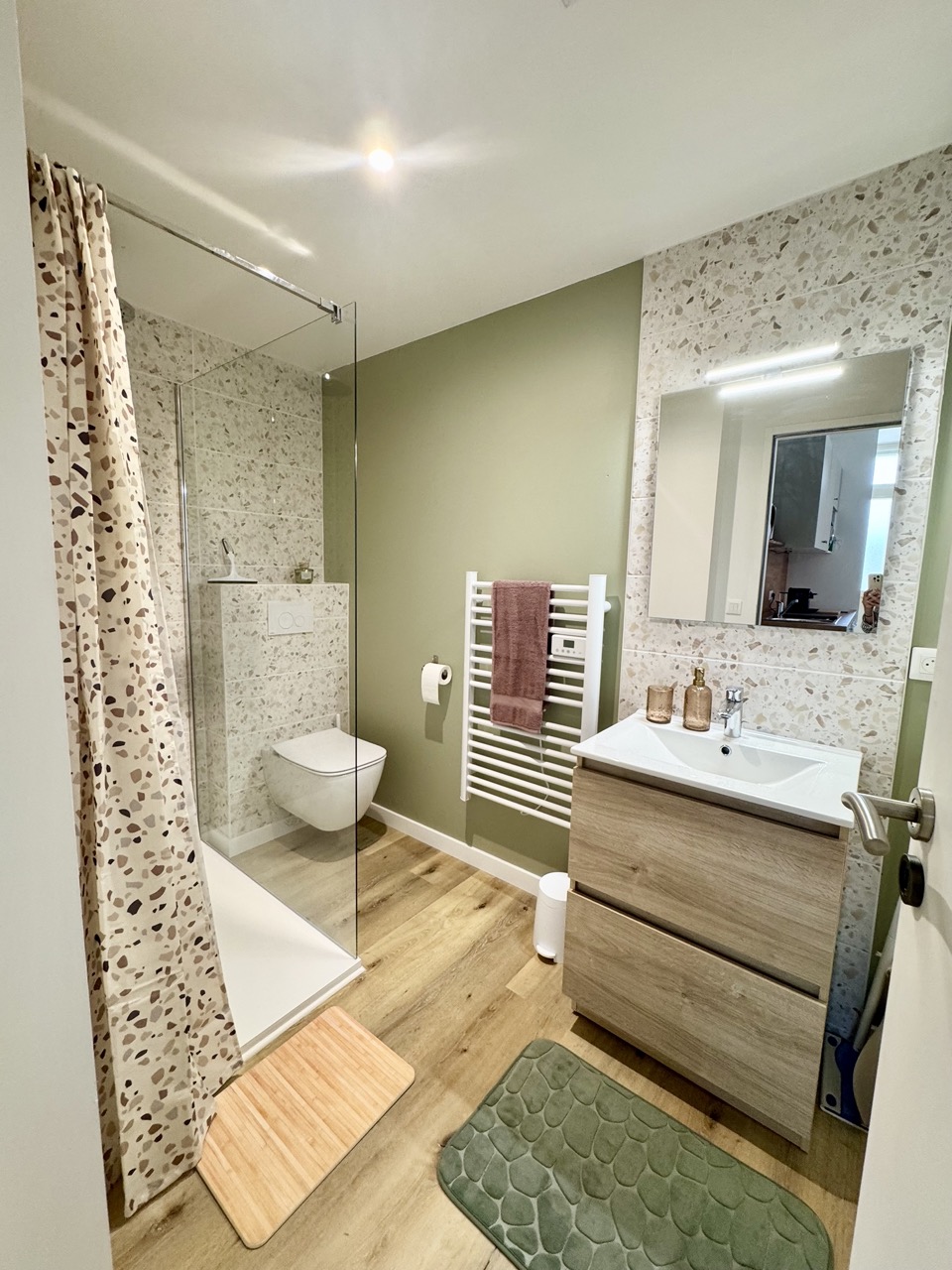 La salle d’eau, pensée comme un véritable espace bien-être, vient compléter l’ensemble avec une grande douche confortable et une ambiance contemporaine. La décoration est sublimée par une faïence effet terrazzo, apportant texture, modernité et caractère à la pièce.