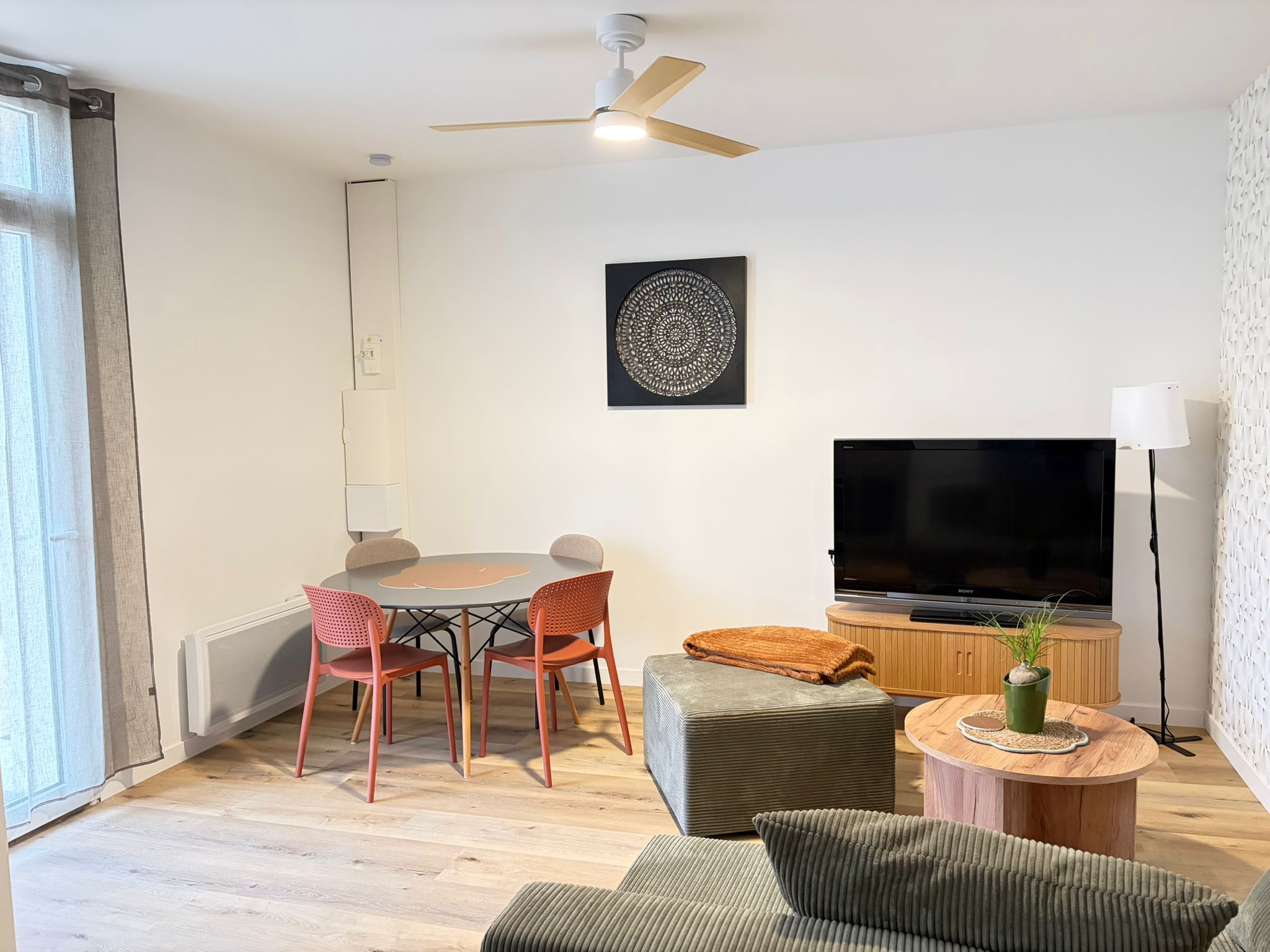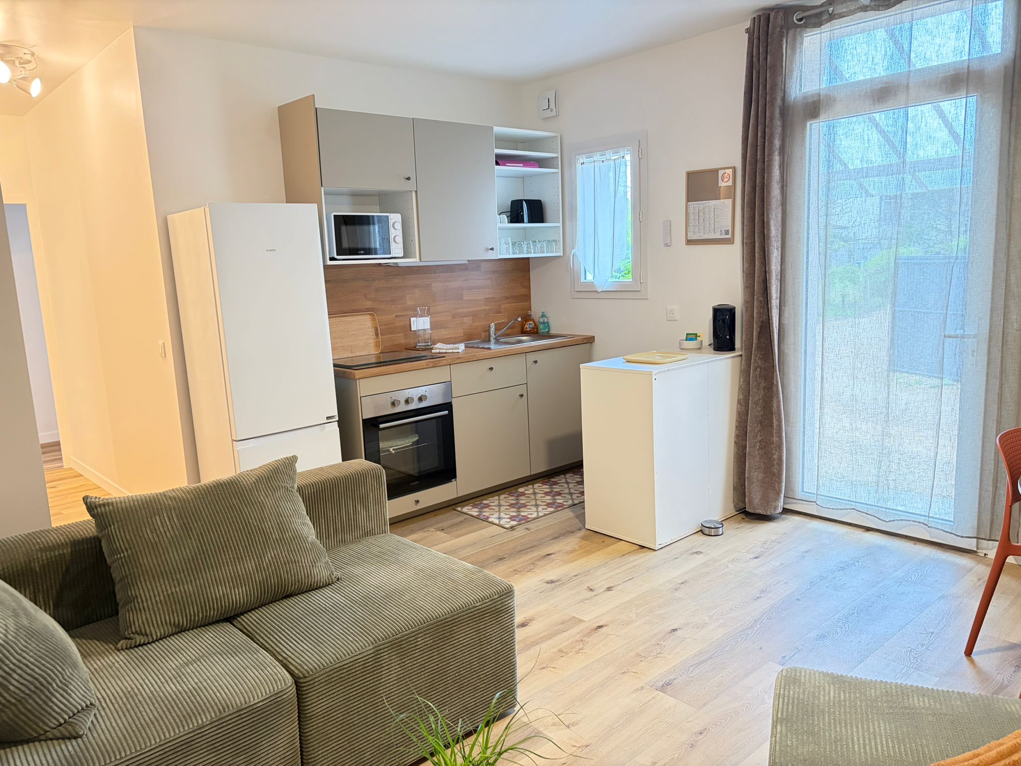 La pièce de vie, généreuse et conviviale, accueille une cuisine entièrement aménagée et équipée, un espace repas pouvant recevoir jusqu’à quatre personnes, ainsi qu’un séjour confortable, pensé pour le quotidien.