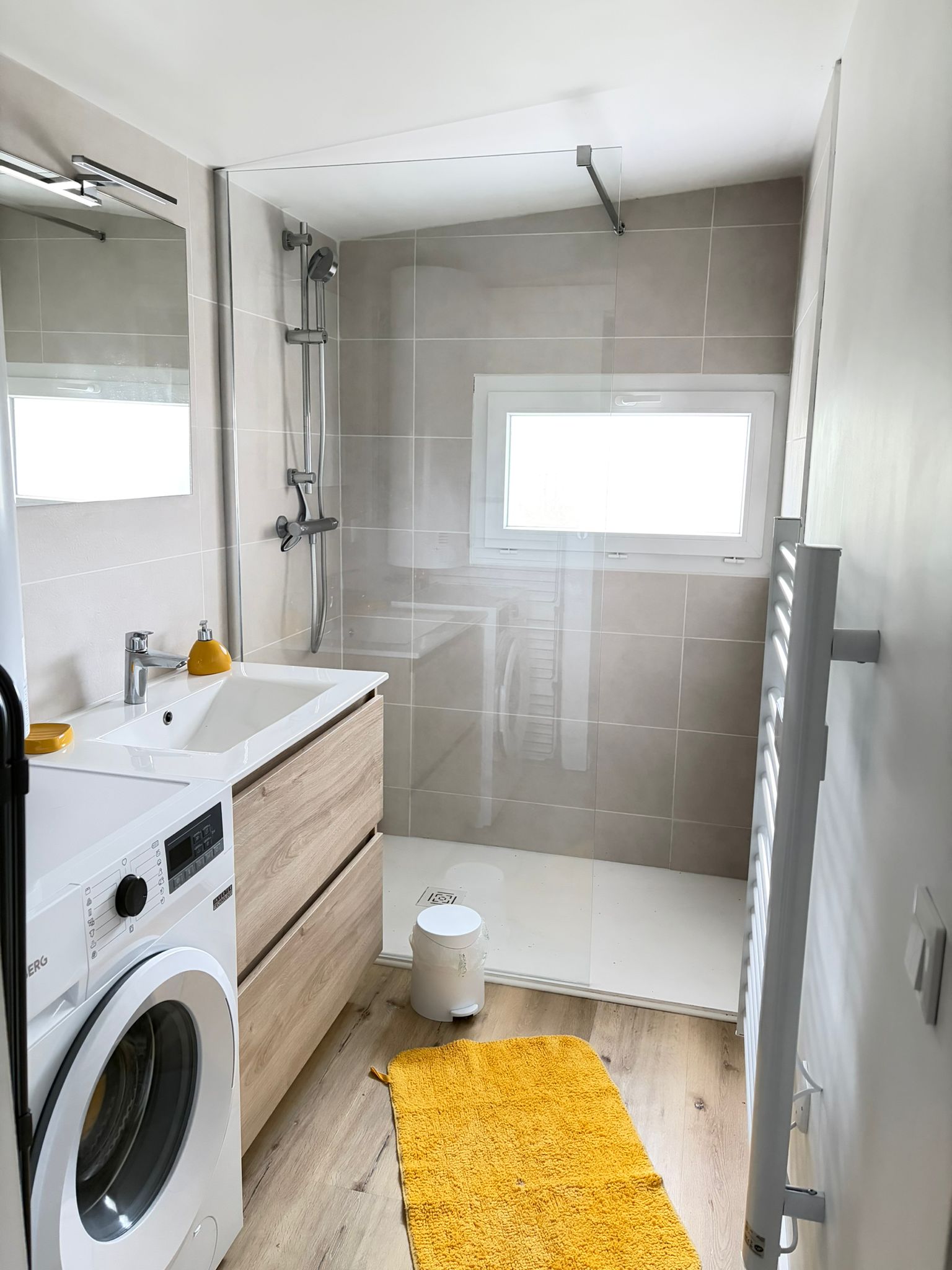 La salle d’eau, équipée d’une grande douche, a été intelligemment implantée dans une ancienne annexe auparavant ouverte sur l’extérieur et non reliée à la maison. Cette transformation a permis d’optimiser l’existant tout en valorisant les surfaces disponibles.