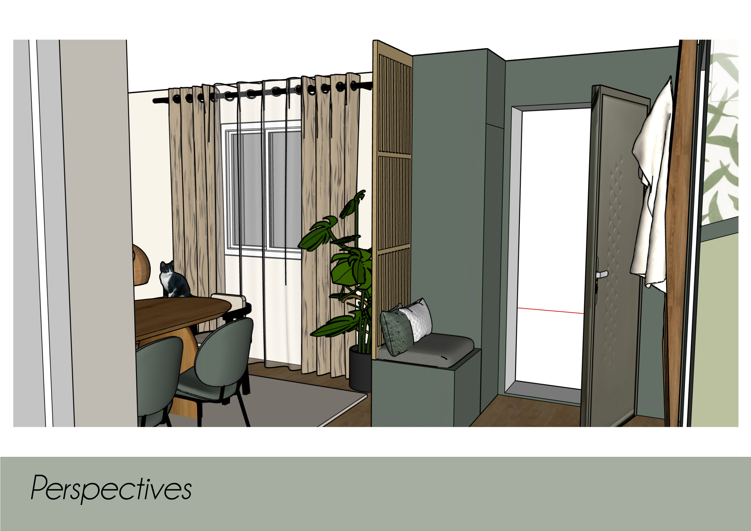 Projet de décoration d’une grande pièce à vivre composée d’une entrée, d’une salle à manger et d’un séjour.